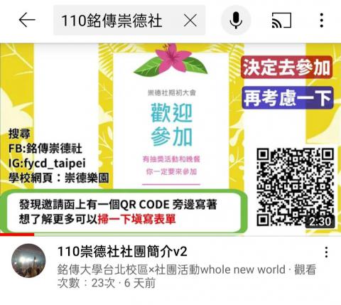 有興趣的人可以到YouTube搜尋110銘傳崇德社去看看喔!