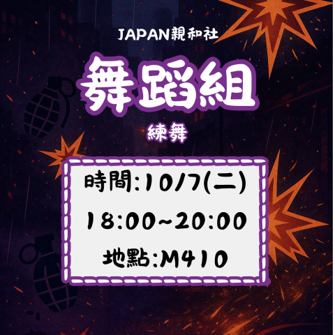 大家好~我們是Japan親和社10/7(二)就是我們舞蹈組第三次社課啦~大家要繼續努力練舞喔~沒有分配到歌的大家也歡迎來這裡玩~時間:10/7(二)18:00-20:00地點:M410期待可以見到大家~